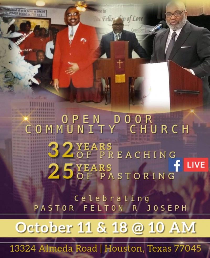 Our anniversary celebration will be streamed LIVE on our church Facebook (Open Door Community Church) page. You are also welcome to join us at our church location. Please note that "masks" are required. Social distancing will be observed and a sanitation station will be available.